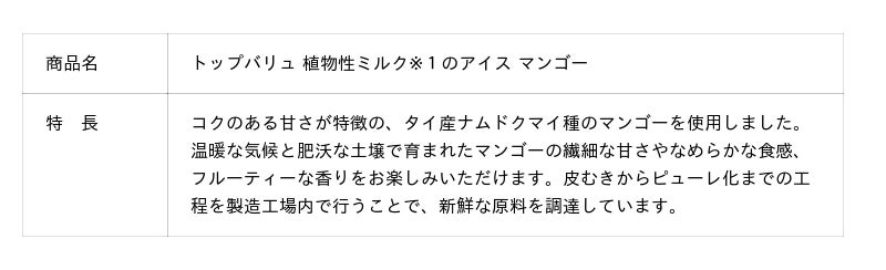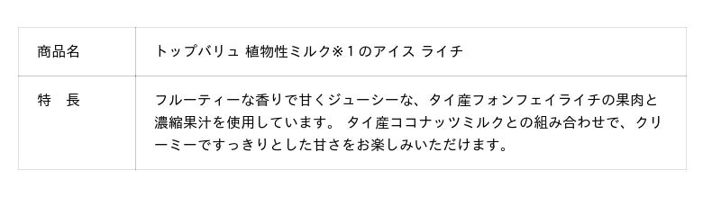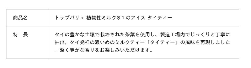本商品はタイ産のココナッツミルクをベースに、相性のよいタイ産のフルーツなどのこだわり素材と組み合わせています。タイは一年を通して温暖な気候と肥沃な土壌に恵まれ、芳醇さとトロピカルな風味を同時に引き立てる素材が豊富に揃います。また、マンゴーのピューレ化や茶葉の抽出を現地工場で丁寧に行うことで鮮度にもこだわることができる点も大きなメリットです。植物性ミルクの軽やかさに、バニラの芳醇な香りやマンゴー・ライチの濃厚な甘み、タイティー由来の深い風味が重なり合うことで、あっさりとしながらもコクのある南国テイストをお届けします。