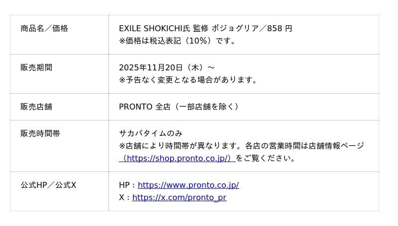 飲食チェーン「PRONTO (プロント)」や「ワインの酒場。 Di PUNTO (ディプント)」などを展開する株式会社プロントコーポレーション(本社:東京都港区、代表取締役社長:杉山和弘)は、2025年11月20日(木)解禁の 「ボジョレー・ヌーヴォー」とともに EXILE SHOKICHI氏監修の「ボジョグリア」を発売いたします。