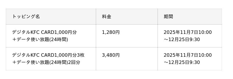 KDDI、沖縄セルラーは2025年11月7日から、povo2.0の「コラボトッピング」として、ケンタッキーフライドチキンの「デジタルKFC CARD1,000円分」と「データ使い放題(24時間)」(注)がセットになったトッピングを1,280円、「デジタルKFC CARD1,000円分3枚」と「データ使い放題(24時間)2回分」がセットになったトッピングを3,480円で提供します。