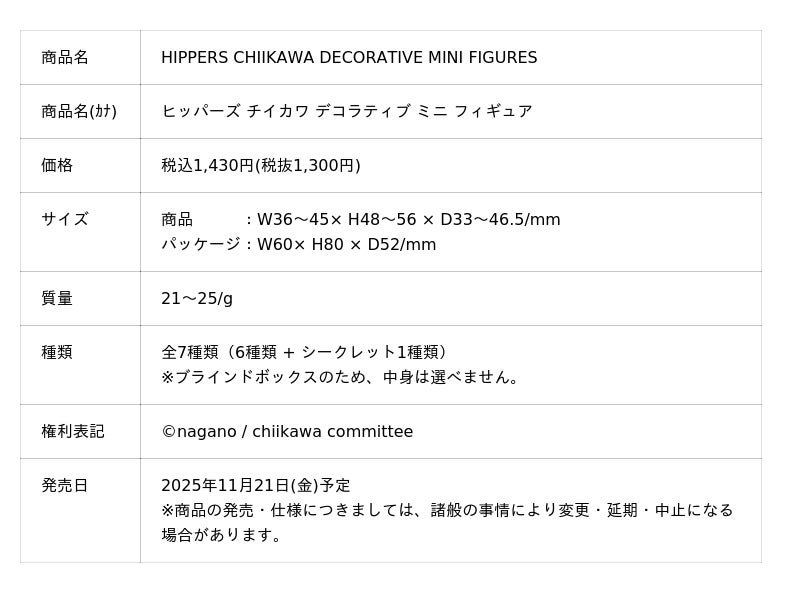株式会社ドリームズ(本社:東京都新宿区/代表取締役 添谷徹)は、イラストレーター・ナガノ氏が描く人気作品「ちいかわ」デザインのデコレーションフィギュア『HIPPERS ちいかわ』を、2025年11月21日(金)より販売開始します。『HIPPERS ちいかわ』では、ちいかわ、ハチワレ、うさぎ、モモンガ、くりまんじゅう、シーサーの6種類+1シークレットがラインナップ。「HIPPERS」とは、日常のさまざまなアイテムに貼りつけて、可愛くデコレーションできるフィギュアです。パソコンやスマートフォン、テレビの上など、身の回りにあるものにくっつけて、いつでもちいかわたちと一緒に過ごすことができます。全国のバラエティショップ・書店およびちいかわらんど、ちいかわマーケット、ドリームズオンラインショップにて順次発売予定です。