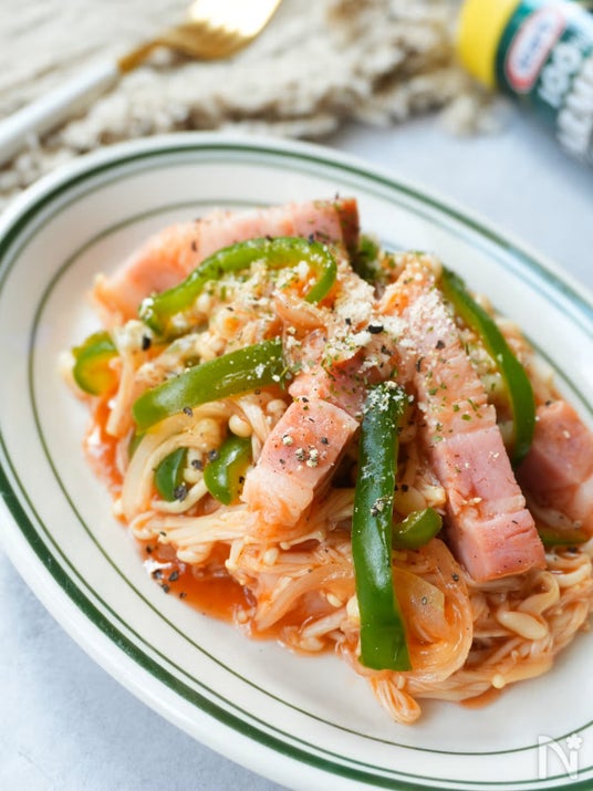 パスタの代わりにえのきを使った、低糖質ナポリタン風レシピ。糖質オフで罪悪感なく楽しめるのはもちろん、パスタをゆでる手間も不要。電子レンジで短時間で仕上がるのもうれしいポイントです。