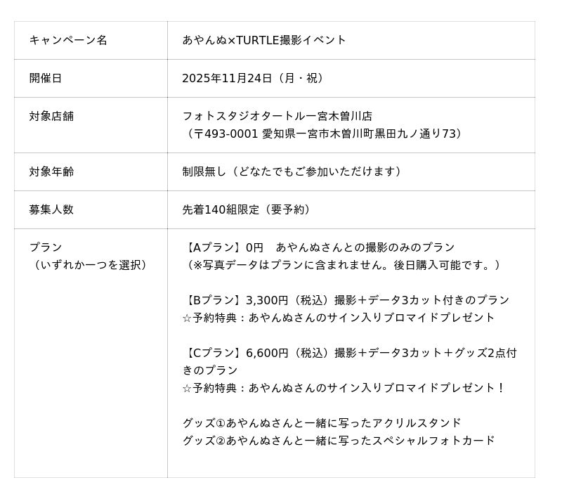 東海地方でフォトスタジオを25店舗運営する株式会社タートル(本社:愛知県春日井市、代表取締役社長:亀山直樹)は、2025年11月24日(月・祝)に、フォトスタジオタートル一宮木曽川店で、エンタメ系ASMRを中心に発信するSNS総フォロワー数180万人超の動画クリエイターあやんぬさんと撮影できるイベントを開催します。