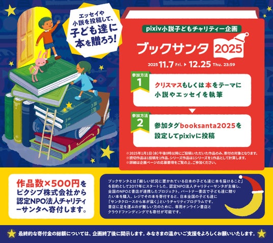 ピクシブ株式会社(本社:東京都渋谷区、代表取締役CEO:丹羽 康弘、以下ピクシブ)は、認定NPO法人チャリティーサンタ(所在地:東京都千代田区、代表理事:清輔 夏輝)が主催する、子どもたちに本を贈る社会貢献プロジェクト「ブックサンタ」に賛同し、「pixiv小説子どもチャリティー企画~ブックサンタ2025~」を開催します。 本企画は2022年に開始し、今年で4回目の開催となります。