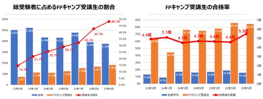 2025年9月のFP1級学科試験において、総受検者3,764名のうちFPキャンプ受講生が占める割合は48.3%※1となり、全体の5割近くに達しました。FPキャンプが開講した2023年7月以降、受検者に占める受講生の割合は7回連続で右肩上がりの成長を続けています。また、今回のFPキャンプ受講生の合格率は84.42%※2と、全体の合格率15.41%の約5.5倍を記録。2023年7月以降の試験において、7回連続で全体合格率の4.5倍を超える高い合格率を達成しています。最年少合格は19歳の大学生で、受講生で初の10代合格者を輩出しました。