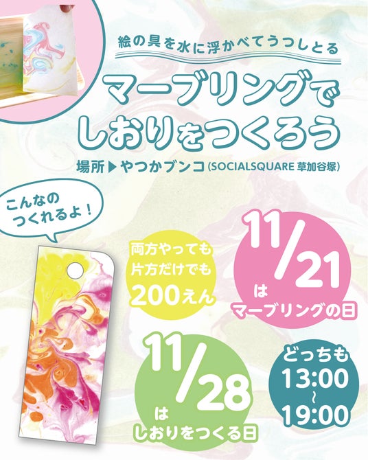 ソーシャルスクエア草加谷塚店(運営法人:NPO法人ソーシャルデザインワークス 代表理事:北山剛)が行うまちの図書室「やつかブンコ」にて、11/21(金)、11/28(金)の2回に分けてしおり作りワークショップを行います!