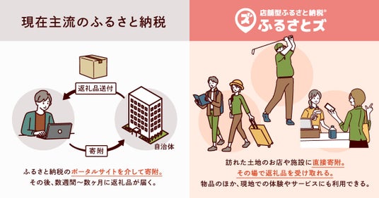 店舗型ふるさと納税(R)『ふるさとズ』は、オンラインでもオフラインでも、好きな店舗で寄附をすることができ、お店のファンがマチを応援できるサービスです。