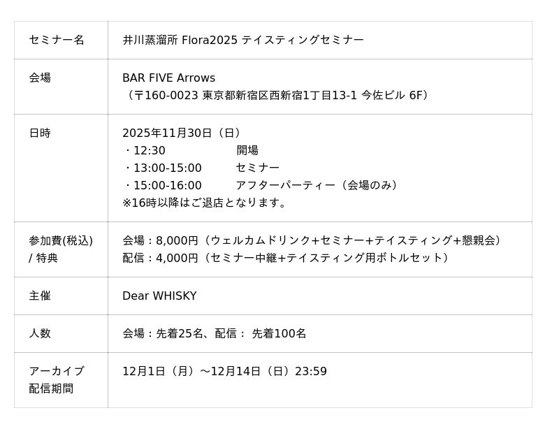 井川蒸溜所 × Dear WHISKY、待望のコラボイベント開催!井川蒸溜所のシングルモルト最新作「Flora 2025」のリリースを記念し、特別なテイスティングイベントを実施いたします。