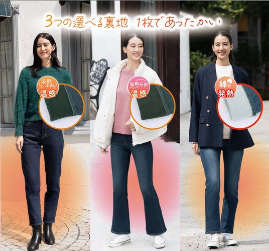 繊維にヒアルロン酸、シルクアミノ酸、マリンコラーゲンを配合し、しっとり柔らかく、ずっと触れていたくなるような穿き心地を実現しました。今年は新たに「綿素材」の裏地タイプが新登場。1.裏シャギー、2.裏ベロアに加え、今年は新たに3.綿素材を追加し、「選べる3種類の裏地」で暖かさを提供します。