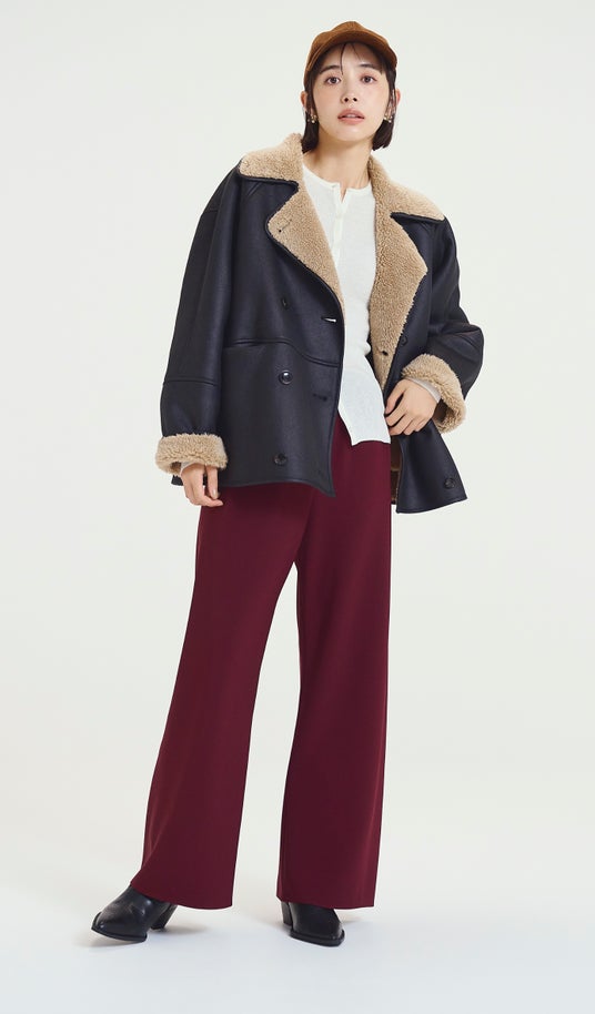 裾まで通ったセンターラインが広がりすぎず美しい落ち感を演出し、ボリュームのあるトップスとも好バランスを生み出します。