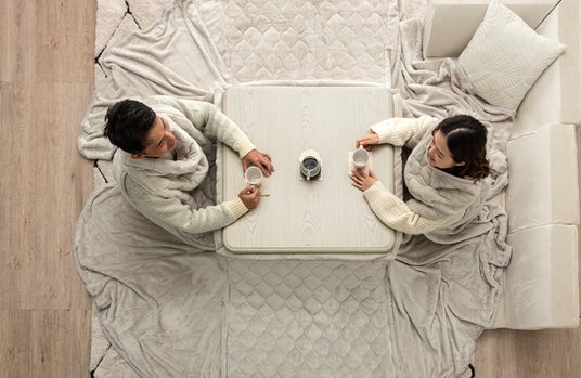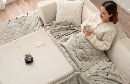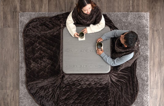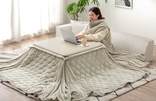 【タンスのゲン】「背中や肩まで暖まれない…」 今までの“こたつ”の課題をこれで解決!腕を通すアームホールと背中で留めるボタンで、こたつ布団を着用~背中までしっかりあったかく