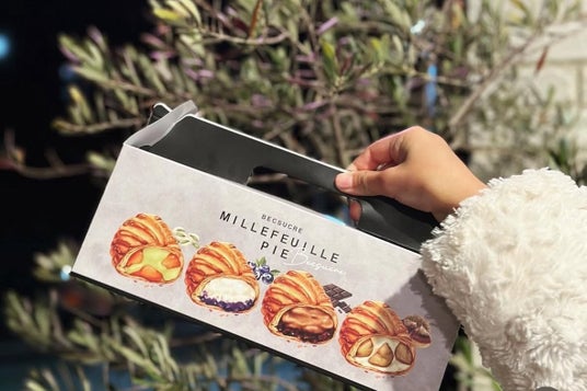 青森県産りんごを砂糖のみで(シナモン他不使用)じっくりキャラメリゼし、香ばしいサクサクのパイ生地に包み込み、こだわりのクリームをたっぷり詰めたアップルパイ。クリームは、カスタード、ショコラ、ピスタチオの計3種類をご用意。