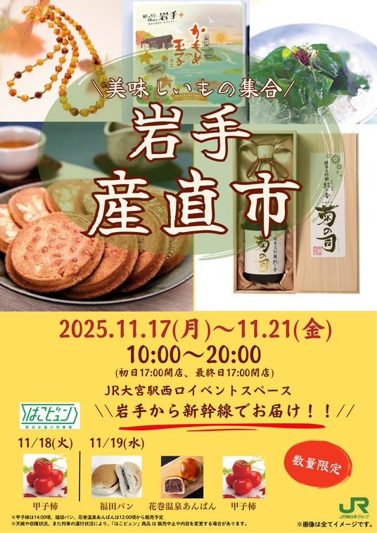 東日本旅客鉄道 (株) 盛岡支社 と(株) JR 東日本青森商業開発 (代表取締役社長 真壁まり子) は 、岩手県と連携して、地域活性化・観光流動の創出を目的とした「岩手産直市」を大宮駅で開催します 。