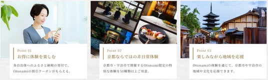 大人のための非日常体験に出会える予約サイト「Otonami(おとなみ)」を展開するJ-CAT 株式会社(本社:東京都中央区、代表取締役:飯倉 竜 以下、J-CAT)は、大阪ガス株式会社(本社:大阪府大阪市、代表取締役社長:藤原 正隆 以下、大阪ガス)および株式会社ギフティ(本社:本社:東京都品川区/代表取締役:太田 睦、鈴木 達哉/以下、ギフティ)が協業のもと「旅先納税(R)︎」※システムを活用し展開する「関西おでかけ納税(R)」※と連携し、「Otonami」で提供する京都市・宇治市の文化体験を、ふるさと納税の返礼品として楽しめる、新しい取り組みをスタートいたしました。