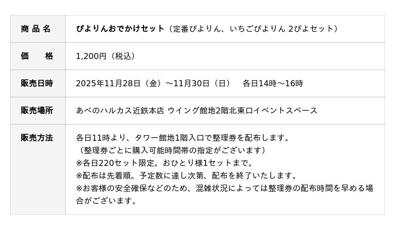 ジェイアール東海フードサービス株式会社(本社:愛知県名古屋市、代表取締役社長:岩下賢一)のオリジナルスイーツ「ぴよりん」が、2025年11月28日(金)~11月30日(日)あべのハルカス近鉄本店(大阪市阿倍野区)にて開催される「近鉄 食の大祭典」にて数量限定で販売されます。