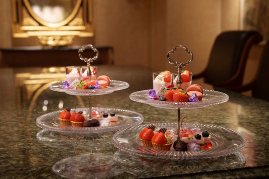 スパークリングワインで乾杯したあとに続くお料理は、レストラン「シェフズ テラス」の定番メニューをコース仕立てでご用意。締めくくりのデザートは、会話にも華を咲かせる見た目にも可愛らしい苺のスイーツ盛合せをハイティースタイルにてご提供いたします。