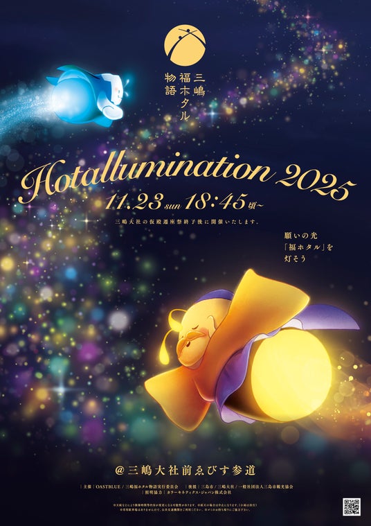 株式会社OASTBLUE(静岡県三島市/代表取締役 神田輝和)、三嶋福ホタル物語実行委員会(実行委員長 渡邉将人)は2025年11月23日(日)に、三島及び伊豆エリアの活性化と、美しい富士山の恵を未来につなぐことを目的に、ホタルをモチーフにした環境にやさしい参加型イルミネーションイベント「三嶋福ホタル物語 Hotallumination(以下、ホタルミネーション)」(後援:三島市、三嶋大社、一般社団法人三島市観光協会/照明協力:カラーキネティクス・ジャパン株式会社)を、下田街道の起点である三嶋大社前ゑびす参道にて開催いたします。