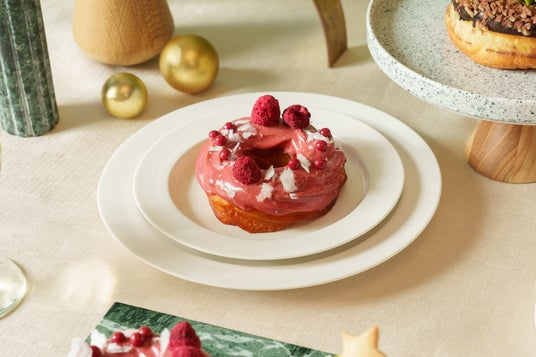ラズベリー&ストロベリーのチョコレートをたっぷりドーナツにつけ、飾りにドライラズベリーとラズベリークラッカンを散りばめた、クリスマスリースをイメージした一品です。