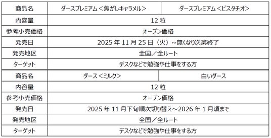 「ダースプレミアム<焦がしキャラメル>」は、焦がしキャラメルとコク深いミルクチョコレートが相性抜群の3層仕立ての「ダース」です。「ダースプレミアム<ピスタチオ>」は、とろけるようなピスタチオの余韻を感じるチョコレートを、クリーミーなホワイトチョコレートで挟みました。