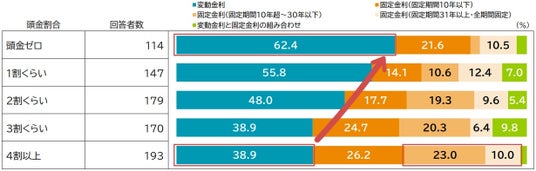 では、“貯蓄はあるけど、頭金ゼロ”にした場合、住宅ローン利用や資産形成に何らかの違いが出てくるのでしょうか。「住宅購入時の保有金融資産が500万円以上あった」と回答した人に絞り、頭金割合別の傾向を確認しました。