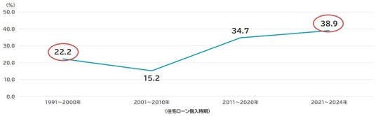 そこで、頭金ゼロを選択した人に、住宅の頭金や諸経費などを支払う前に保有していた金融資産額を尋ねました。その結果、保有金融資産が500万円以上あった人の割合は、住宅ローン借入時期が1991~2000年では22.2%だったのに対し、2021~2024年では38.9%へと16.7ポイント増加していることがわかりました(図表2)。