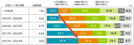 しかし、2021年~2024年の借入れでは、「頭金ゼロ」が36.9%で最も多く、「1割くらい」も22.9%と高い割合を占めています。一方で、かつて主流であった、「2~3割くらい」は合わせても24.1%にとどまります。