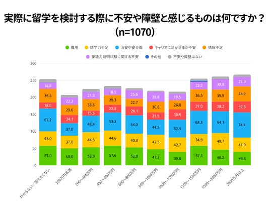 特に世帯年収が低・中所得層では費用の不安が強い傾向にあり、年収が上がるにつれ「治安」や「情報不足」など、別の課題意識が増加。「安心して留学できる環境づくり」が依然として課題であることが分かりました。