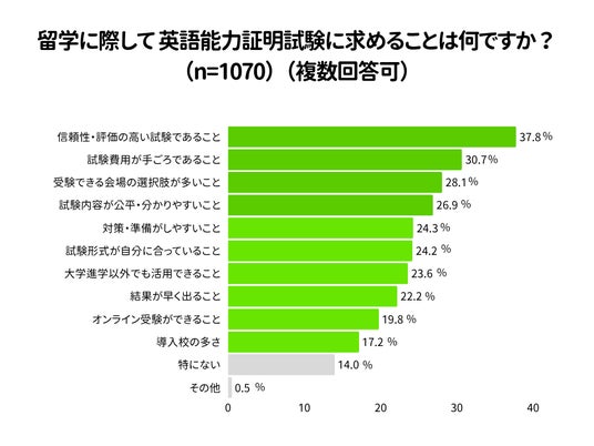 – 英語力証明試験に求めるのは「信頼性・評価の高い試験であること」が最多(37.8%)、次いで「試験費用が手頃であること」「受験できる会場の選択肢が多いこと」「試験内容が公平・分かりやすいこと」