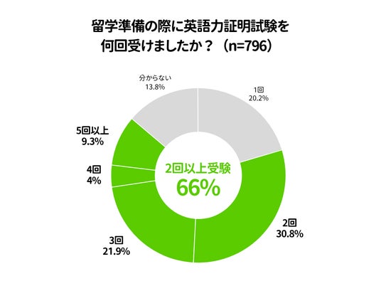 英語力証明試験の受験回数は2回以上受けている人が66%にも上り、既定点数を満たすために複数回受験する実態が明らかになりました。