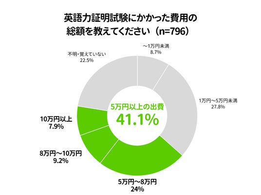 – 英語力証明試験は2回以上受けている人が66%。試験にかかった費用は5万円以上の出費が41.1%にのぼり、経済的な負担の大きさが浮き彫りに
