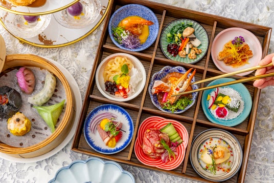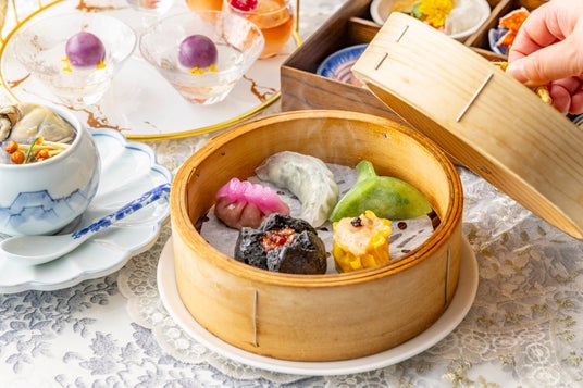 点心は、熱々の状態でお席までお届けし、お好きなものをお好きなだけお楽しみいただけます。皮に抹茶を練りこんだ「翡翠抹茶海老蒸餃子」、「ラベンダーカラーの豚肉と野菜の餃子」や「海老入りポーク焼売 トリュフ飾り」などの蒸し点心、「海老と野菜のライスペーパー春巻」や「五目揚げ団子」などの揚げ点心など、ワンランク上の点心を心行くまで味わっていただけます。