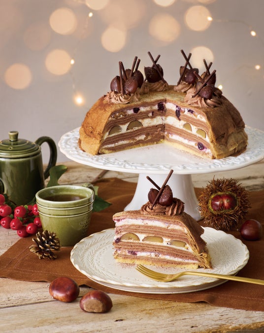 さらに、今年のクリスマスシーズンは、季節を感じる2つの味わいが仲間入り。旬のラ・フランスを使用した「ラ・フランスと自家製キャラメルクリームのミルクレープ」は、みずみずしい果肉と、とろけるような食感がお楽しみいただけるクリスマスシーズン前半の新作です。後半を彩るもうひとつの新作「マロンとチョコレートクリームのミルクレープ」は、栗とチョコレートの組み合わせにカシスの酸味とクルミをアクセントに加えました。