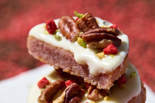 ホワイトチョコレートの白に、ベリーの鮮やかな赤とピスタチオの緑が映え、ホリデーシーズンにもぴったりの見た目にも華やかなナッツケーキです。