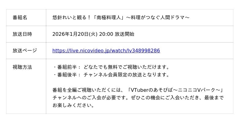 株式会社ドワンゴが運営するニコニコ公式チャンネル「VTuberのあそびば~ニコニコVパーク~」の人気生放送番組「VTuberと観る!映画実況シリーズ」に、雇われマスター・VTuber悠針れい の出演が決定いたしました。