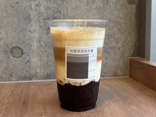 ただの映えドリンク?いえ、違います。これは、カフェがあるさくら構造本社の、まさに直下の地層を完全再現した、地盤オタク歓喜の「飲める地層断面」なのです。
