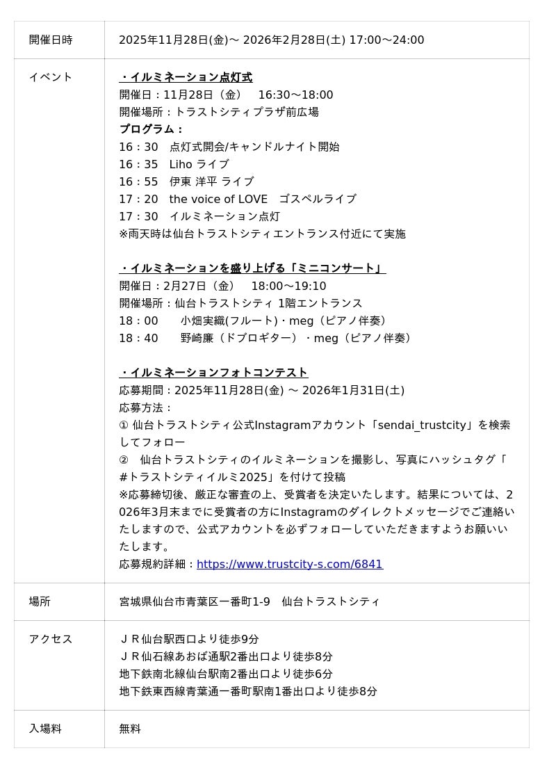 仙台トラストシティでは、2025年11月28日(金)から 2026 年2月28日(土)までの期間、「仙台トラストシティ Winter Illumination 2025-2026」(以下:ウィンターイルミネーション 2025-2026)を開催いたします。
