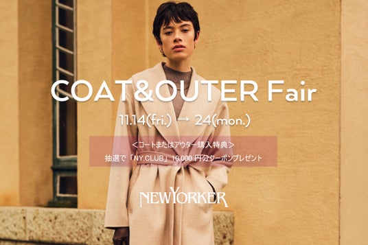 アウターが主役となるこれからの季節。トラディショナルで洗練されたスタイルを提案するNEWYORKERより、クラシックな雰囲気で大きめなショールカラーが特徴のエレガントなリバーロングコートが登場。今シーズン新作のコート&アウターをご紹介いたします。フェア期間中、コートまたはアウターを購入で¥10,000分のクーポン券(当日入会も対象)を各店1名様に抽選でプレゼント!ぜひ、この機会にご来店くださいませ。