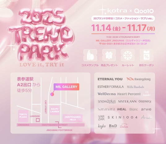 大韓貿易投資振興公社(KOTRA)(本社:東京都千代田区、代表者:朴容珉)は、eBay Japan合同会社(本社:東京都港区、代表取締役:ク・ジャヒョン)が運営する総合ECプラットフォーム「Qoo10」の協力のもと、2025年11月14日(金)から11月17日(月)までの4日間、東京・表参道のMIL Galleryにて、韓国の代表ブランドに出会えるリアル体験イベント「2025 Qoo10 TREND PARK」を開催します。