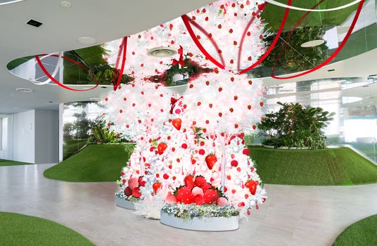 雪をイメージしたホワイトと冬の澄んだ空のスカイブルーを基調に、「いちごが実る冬の空の公園」を装飾で表現しました。公園の中に点在する鮮やかないちごはまるで冬空に咲く小さな花のよう。