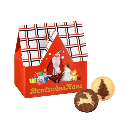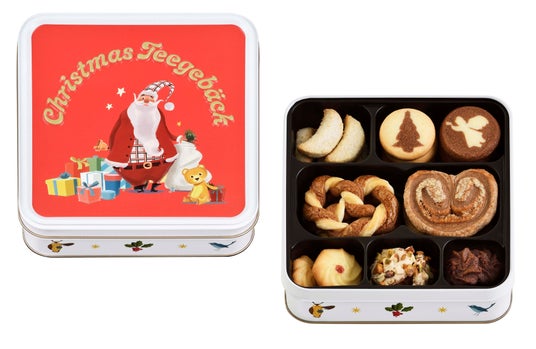 バターの風味を楽しめる生地と、カカオの風味がほろ苦い生地を組み合わせたビスケット。 トナカイとツリーの2種類の絵柄入り。