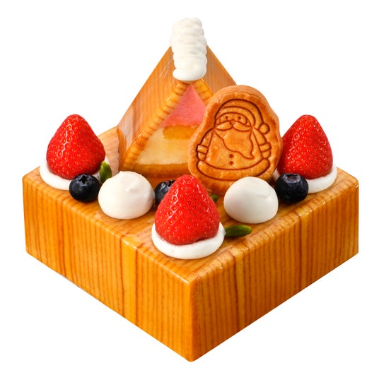 土台部分はココアスポンジ生地と、アーモンドプラリネ入りのチョコ生クリーム・スイートチョコムース・ミルクチョコムースを交互に重ね、濃厚ながらまろやかな味わいに。更にラズベリーの華やかな甘酸っぱさが、チョコレートの甘みを引き立てます。天面には煙突に見立てたロールケーキと、職人手作りのさくさくバタービスケットのサンタクロースを飾り付けました。
