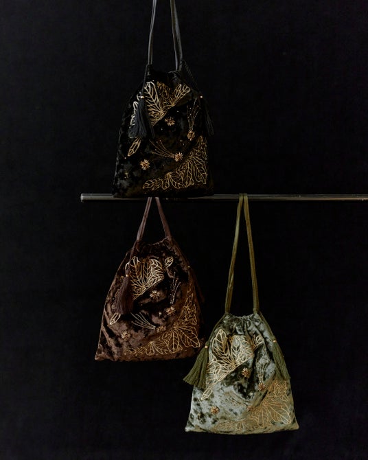 ビーズ刺繍で表現した、ホリデーにもふさわしいデザインの巾着バッグは、