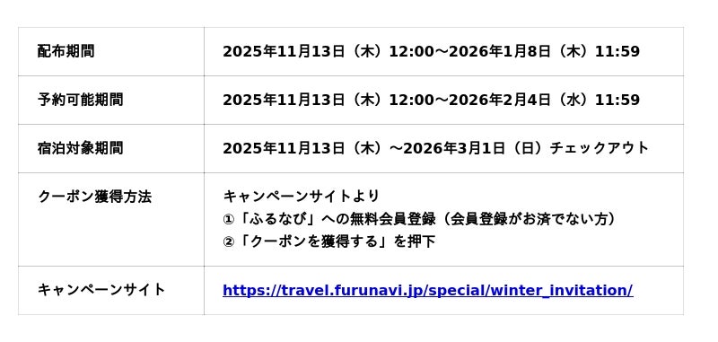 ふるさと納税サイト「ふるなび」を運営する株式会社アイモバイル(本社:東京都渋谷区、代表取締役社長:野口哲也、東証プライム市場)は、旅行予約サイト「ふるなびトラベル予約」にて、冬のクーポンキャンペーンを開催!先着予約数限定で最大30%OFFとなるお得なクーポンを本日より配布いたします。お得に旅行を楽しむチャンスをお見逃しなく!