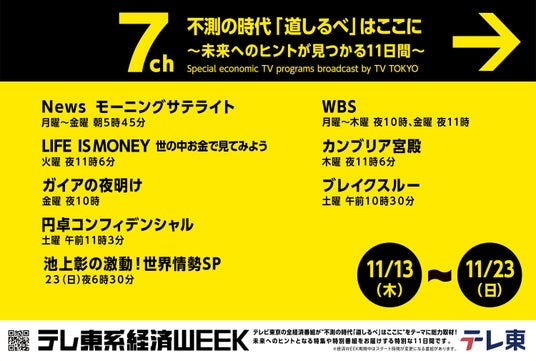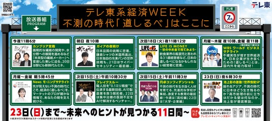 テレ東では、11月13日(木)~23日(日)の11日間、全経済番組が同一のテーマを扱い経済番組を盛り上げる、「テレ東系経済WEEK」を実施いたします!今回で5回目を迎える「テレ東系経済WEEK」のテーマは、『不測の時代「道しるべ」はここに~未来へのヒントが見つかる11日間~』です。終わりの見えない戦乱に加え、トランプ米大統領の登場で、これまで以上に予測不能な時代が訪れています。日本の政治や経済の枠組みも大きな変革期を迎えている今、ビジネスの世界で生き残るための「道しるべ」はどこにあるのでしょうか。今年の経済WEEKでは、未来を指し示すヒントになるようなコンテンツをお届けします。