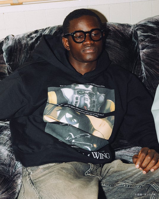 『機動戦士Gundam GQuuuuuuX』より、シュウジが描いたグラフィティを見上げるマチュを大胆にプリントしたコラボフーディ。
