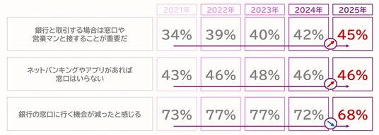 一方で、「ネットバンキングやアプリがあれば窓口はいらない」という意識は3ポイント増加し、「銀行の窓口に行く機会が減ったと感じる」という意識も2021年より5ポイント減少しました。これらの結果から、窓口の重要性は2021年より全体で上昇傾向にあり、銀行窓口が必要と考える人と不要と考える人がほぼ半々となっています。現在はまさにデジタルバンク化への過渡期であると考えられます。