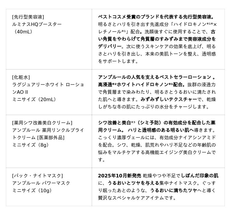 「アンプルール ルミナスコレクション」は、みずみずしい透明感と明るさを放つ肌を目指すためのブライトニング*²・コレクションです。主役の「ルミナスHQブースター」現品に、人気のローション、薬用シワ改善美白クリーム、そして2025年10月発売の新作ナイトマスクのミニサイズをセット。輝く雪の結晶の煌めきをイメージした特別なパッケージに、ブランドの自信作が凝縮されています。