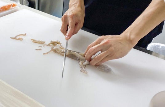 お客様ご自身で生簀から活きのいいタコを取り上げていだきます。スタッフが目の前の調理台ですぐに捌きます。食べられない部分のみカットし、そのは全部使って提供いたします。
