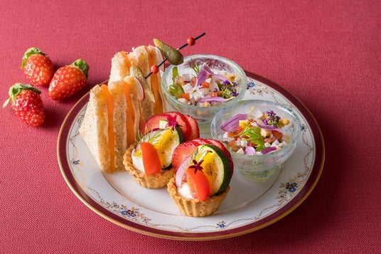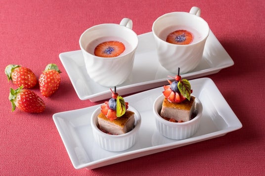 華やかなスイーツとともに味わえるのは、苺の新しい魅力を引き出したセイボリー。苺と鶏肉のサラダや、白ワインビネガーを効かせた冷製苺スープ、
