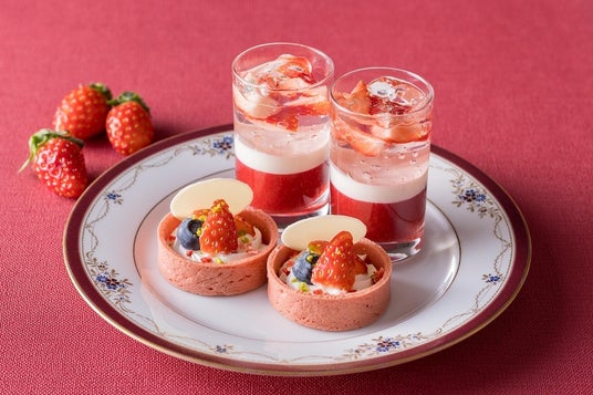グリル野菜とクリームチーズのタルトなど、甘酸っぱい果実を料理のアクセントに仕上げました。さらに、スモークサーモンサンドや、オールスパイスとハチミツで味わう鴨肉のローストなど、苺の香りと調和するメニューもラインナップ。スイーツとはひと味違う、苺の表情をお楽しみください。