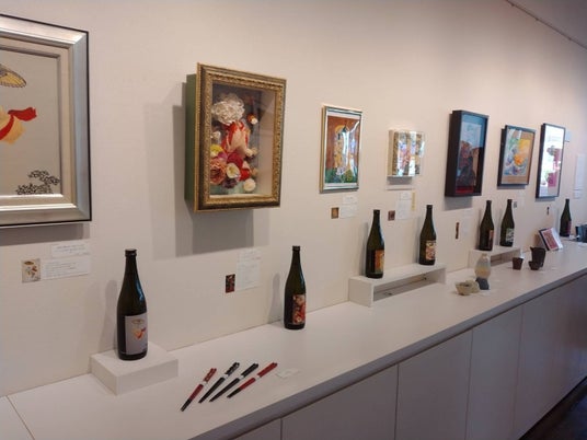 作品と、ラベルになった酒瓶を会場で展示し、作品販売の他、お気に入りのラベルを貼ったお酒も購入できる。(購入は一ノ蔵 直営店ECサイトより)